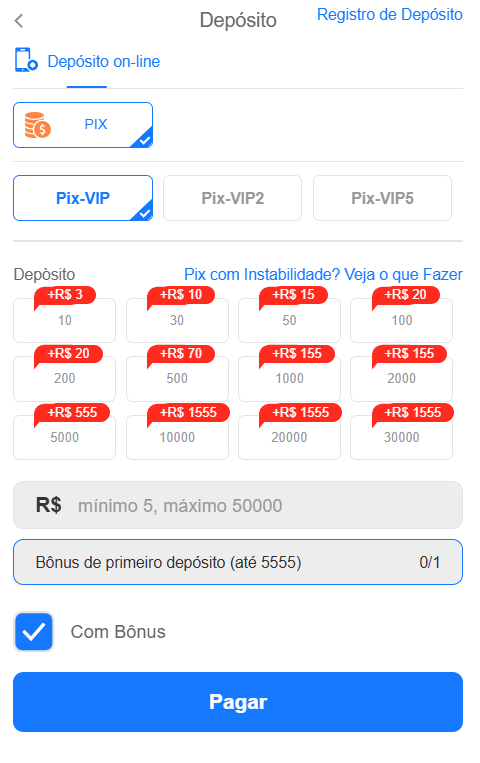 Interface Amigável: A área de Depósito Online permite escolher valores pré-definidos para facilitar sua gestão de banca.